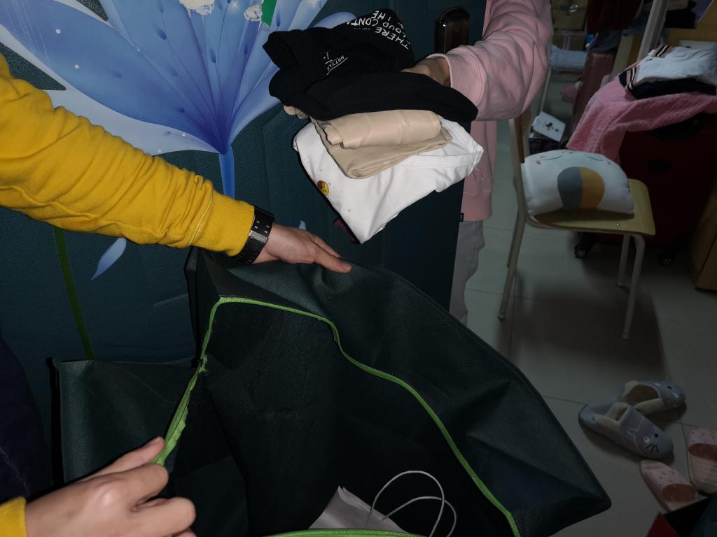 活动当天,部员们提前到达13号楼三楼活动室进行活动前准备,在回收过程中,部员们礼貌地敲门并且询问是否有旧衣物需要回收,最后向同学们表示真挚的感谢。同学们同样积极配合部员们的工作,热情地迎接并将整理收拾好的旧衣物放到编织袋中。更有4号楼与9号楼的同学在活动开展前将旧衣物送到红十部员宿舍,由部员统一整理送到13号楼三楼活动室。回收活动结束后,部员们纷纷将回收好的旧衣物送到三楼活动室分类、整理、存放,本次回收的旧衣物填满了三大个编织袋。在整理结束后部员积极打扫活动室,副会长为部员们拍照留念。