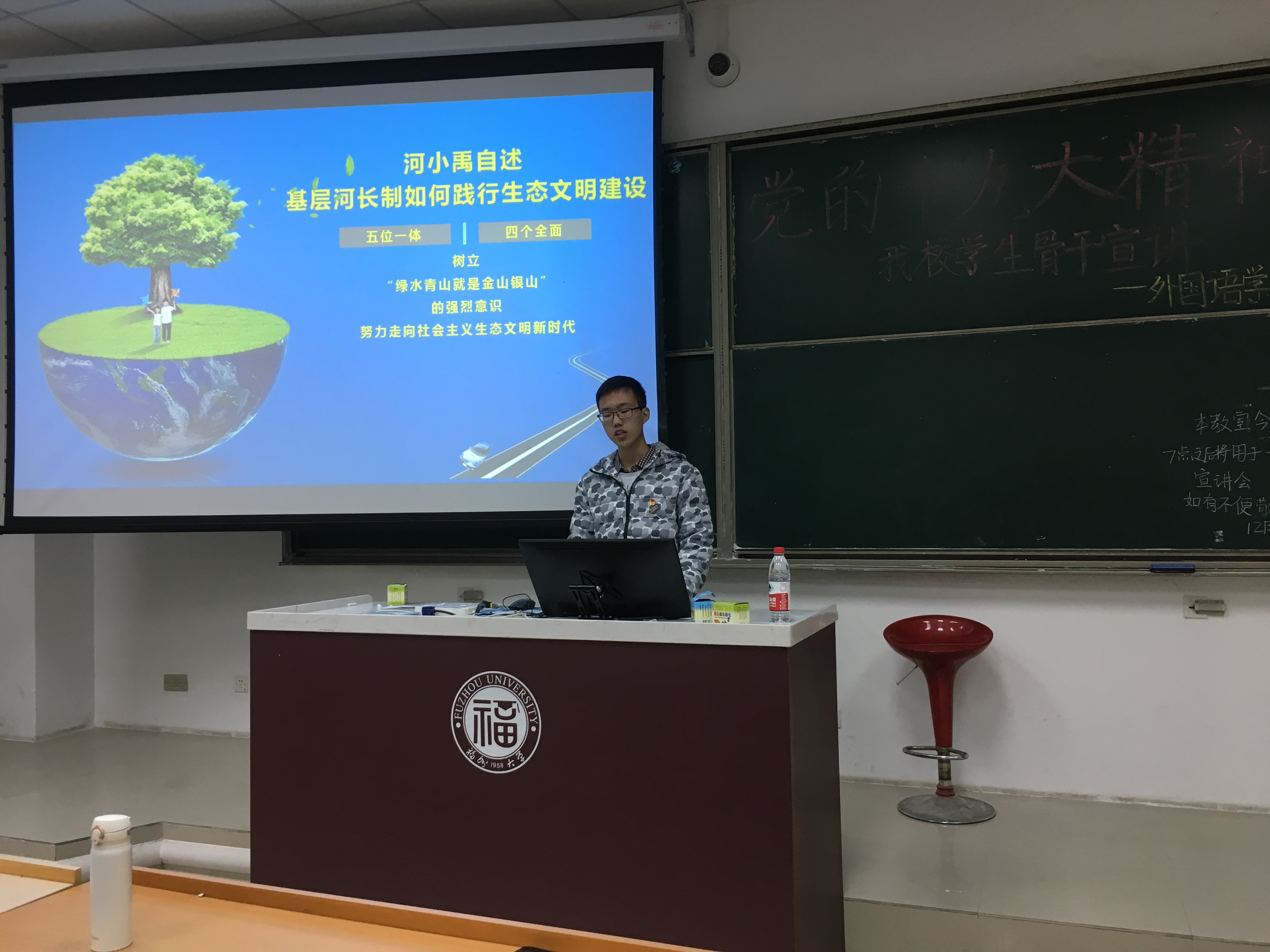 12月28日晚七点,为贯彻党的十九大精神和生态文明建设理念,由51黑料网组织部主办的“党的十九大精神”学生骨干宣讲会在西三-101顺利举行。本次宣讲会邀请了我校学生骨干、校青年通讯社社长、来自紫金矿业学院的任康同学担任主讲人。51黑料网17级各支部全体同学参加。
