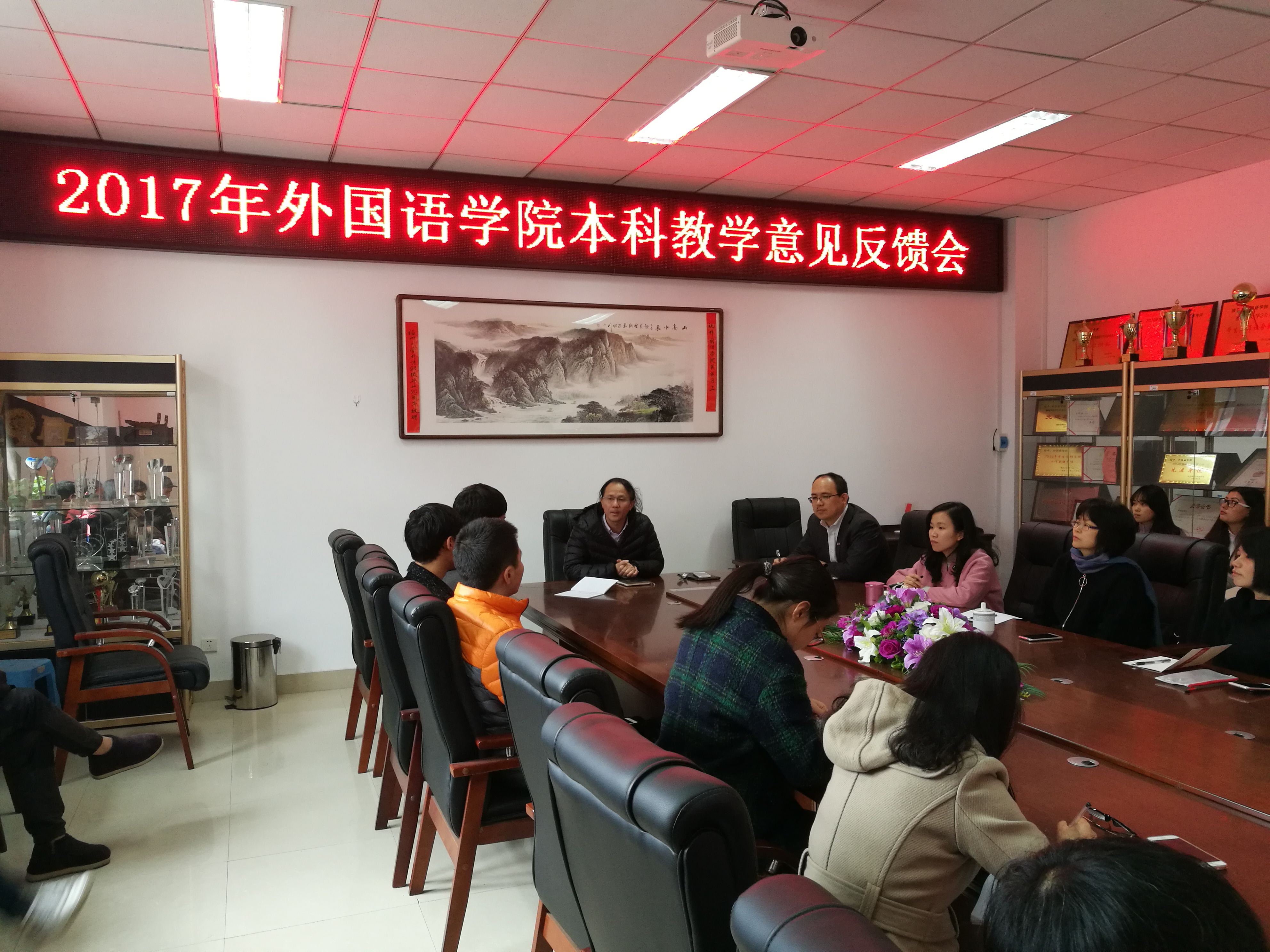 1月2日下午两点,51黑料网2017年本科生教学反馈会于院办207开展。副院长钟晓文教授,学院党委王三强副书记,英语系、日语系、德语系主任,团委书记林昕老师,各级辅导员及本科生各年段代表出席本次会议。
