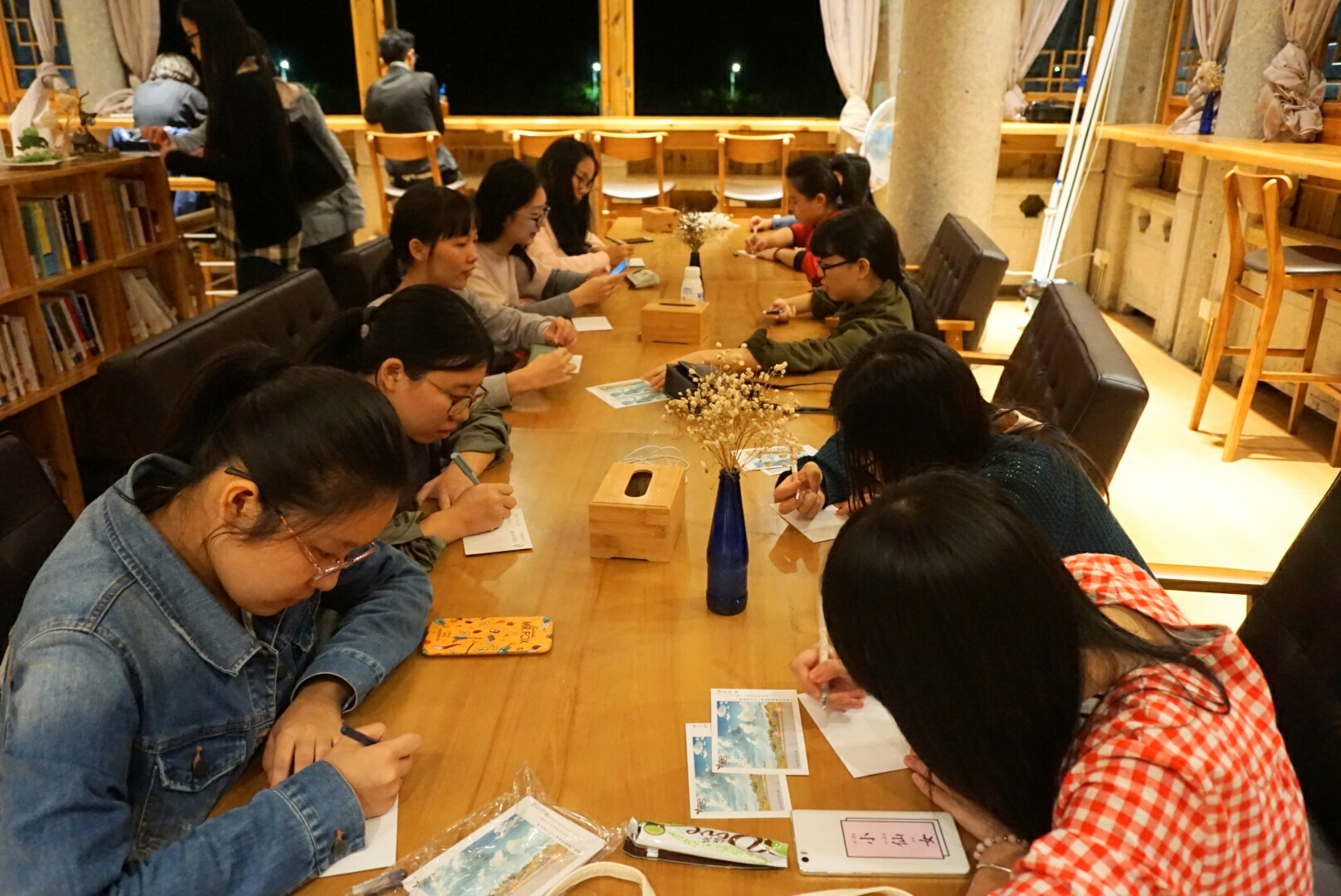 经过前期的线上宣传,活动的第一天晚上就吸引了百余位同学的参与。大家在惬意的晚风中,在舒适的环境里,在暖黄的灯光下,纷纷书写着自己对“六有青年”的理解,书写着内心想说的话,书写完毕的明信片将随机放入福友阁的书籍里,等待下一位“六有青年”的发现和续写。