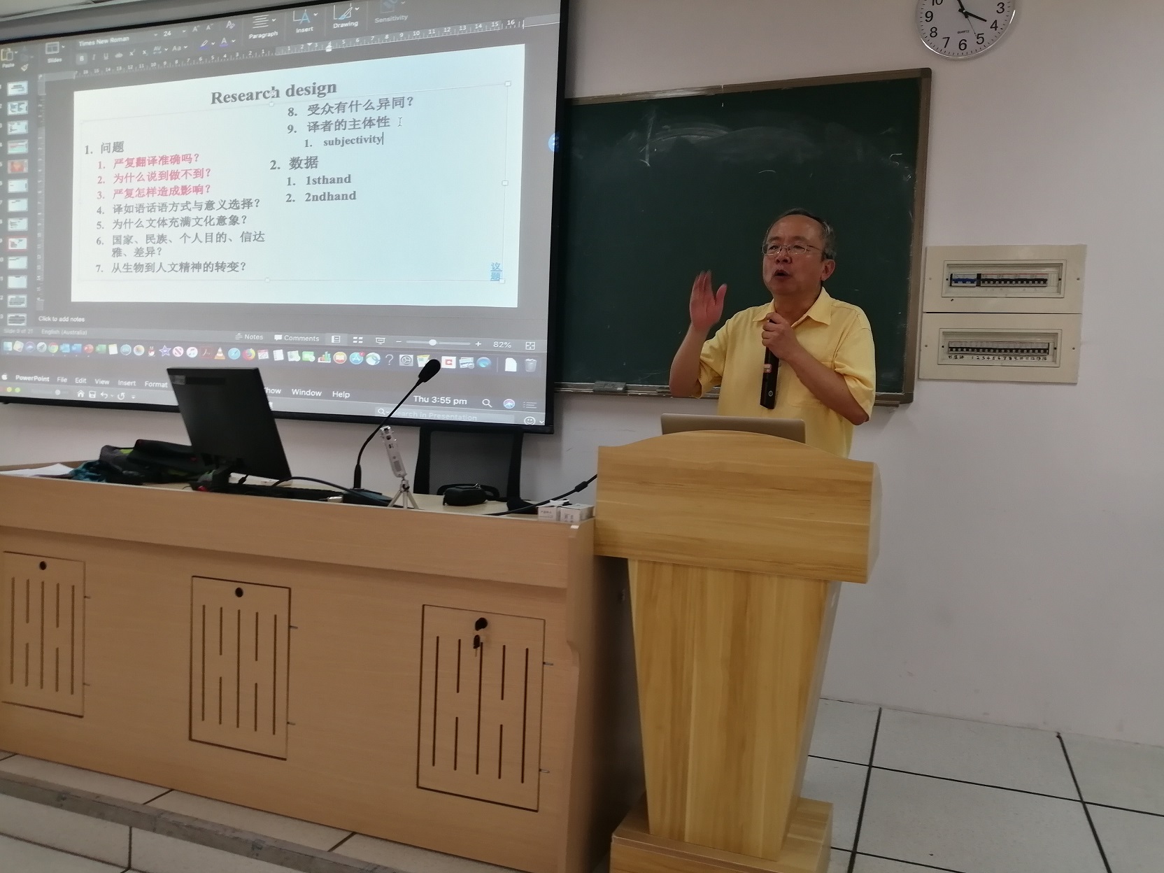 讲座中,钟勇教授以《天演论》的两个中文译本为例,对原文和译文进行分析,从中找出“研究问题”,凝练问题,通过相关理论对问题进行初步把握、解剖、分类,并尝试设计研究课题,对数据进行初步分析,在此基础上建立个性化叙事,并以此为基础搭建论文结构,现场撰写论文部分片段,比如摘要、简介、课题设计、结论等。